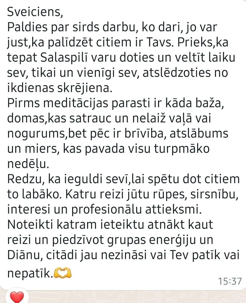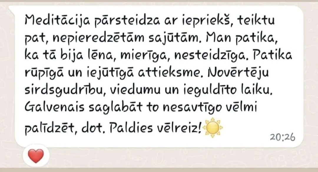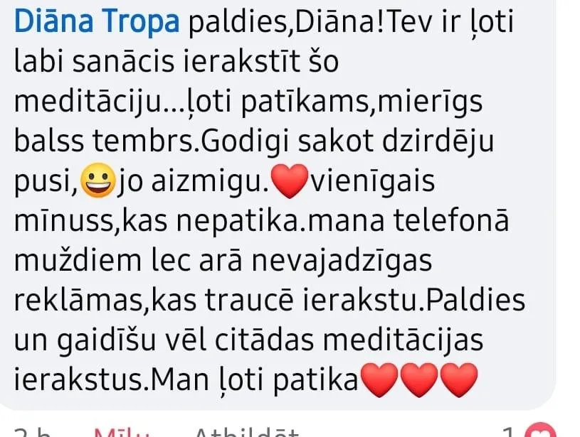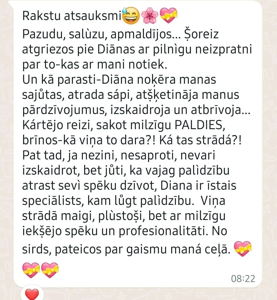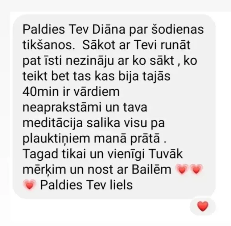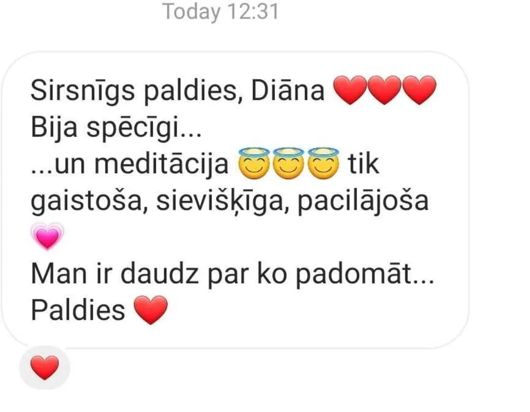 Paldies, Diāna, par Tavu darbu. Piedalījos sieviešu kopīgā meditācijas pasākumā, lai gan neesmu šādu pasākumu piekritēja, bet kaut kas lika apmeklēt. Biju domājusi, ka varētu būt diezgan neveikli ar citām, nepazīstamām dāmām, meditēt, bet pasākums izvērtās ļoti jauks un lika justies diezgan brīvi un nepiespiesti. Nodarbības laikā, vairāk sapratu savu sāpi, un laikam pat pieņēmu to ka man viņa ir tik liela. Neiztika arī bez kādas izlietas asaras, bet tas noteikti nelika justies neērti, gluži pretēji, pēc tam jutos atvieglota. Diāna, Tu noteikti ar savu darbu un klātbūtni liec justies brīvi un nepiespiesti, jautājumi ko uzdod, liek paskatīties dziļāk, padomāt un kļūt apzinātākam. Paldies Tev! Noteikti iesaku Diānu kā speciālistu pie kā vērsties pēc palīdzības, lai labāk sevi izprastu un vieglāk tiktu galā ar ikdienas emocionālajiem izaicinājumiem.