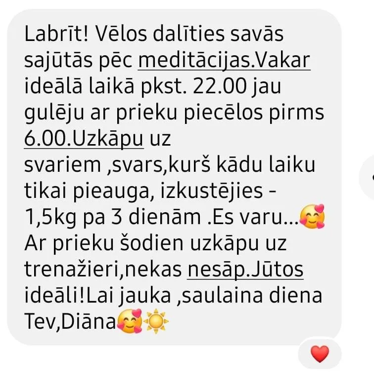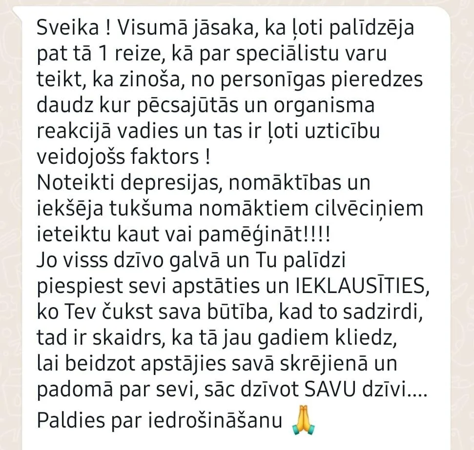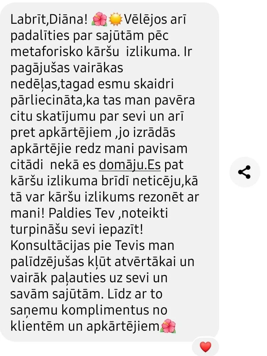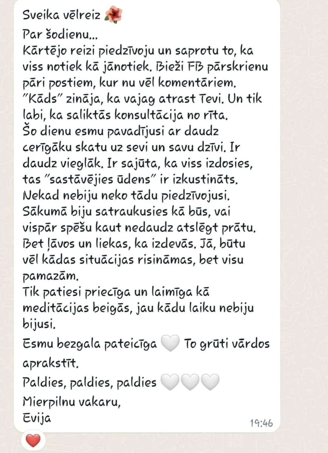 Paldies, Diāna, par Tavu darbu. Piedalījos sieviešu kopīgā meditācijas pasākumā, lai gan neesmu šādu pasākumu piekritēja, bet kaut kas lika apmeklēt. Biju domājusi, ka varētu būt diezgan neveikli ar citām, nepazīstamām dāmām, meditēt, bet pasākums izvērtās ļoti jauks un lika justies diezgan brīvi un nepiespiesti. Nodarbības laikā, vairāk sapratu savu sāpi, un laikam pat pieņēmu to ka man viņa ir tik liela. Neiztika arī bez kādas izlietas asaras, bet tas noteikti nelika justies neērti, gluži pretēji, pēc tam jutos atvieglota. Diāna, Tu noteikti ar savu darbu un klātbūtni liec justies brīvi un nepiespiesti, jautājumi ko uzdod, liek paskatīties dziļāk, padomāt un kļūt apzinātākam. Paldies Tev! Noteikti iesaku Diānu kā speciālistu pie kā vērsties pēc palīdzības, lai labāk sevi izprastu un vieglāk tiktu galā ar ikdienas emocionālajiem izaicinājumiem.