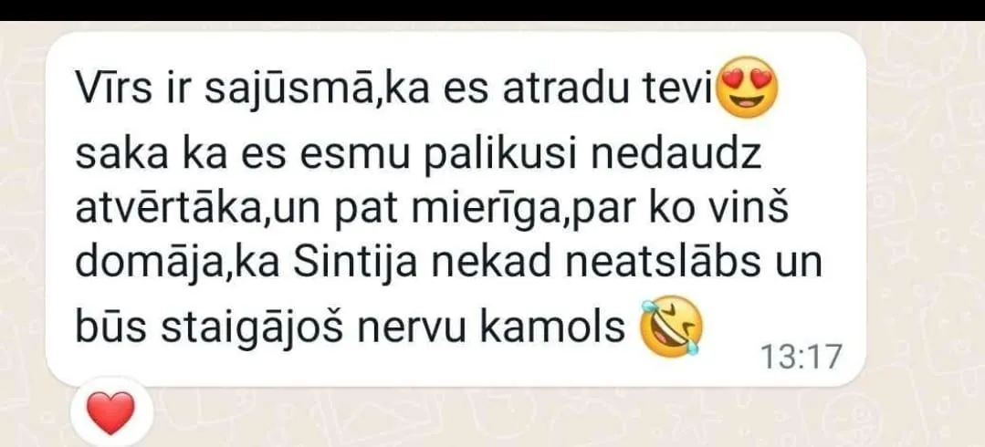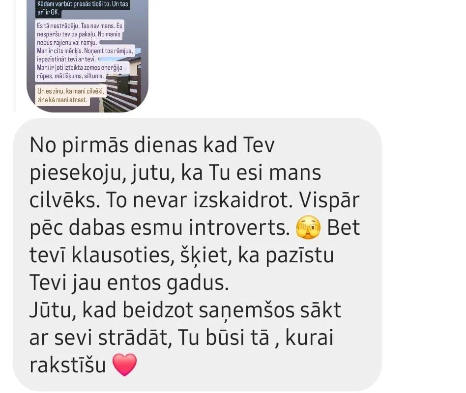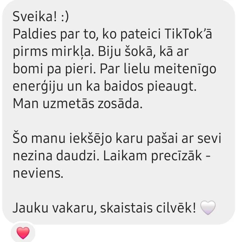 Tu man daudz esi iemācījusi! Lai cik dīvaini neliktos, bet manī ir pamodies sevis pašas dziedināšanas spēks! Es atrodu prieku dzīvot tur-sevī- arī tad, kad situācija šķiet bezcerīga. Paldies, ka tu man esi.