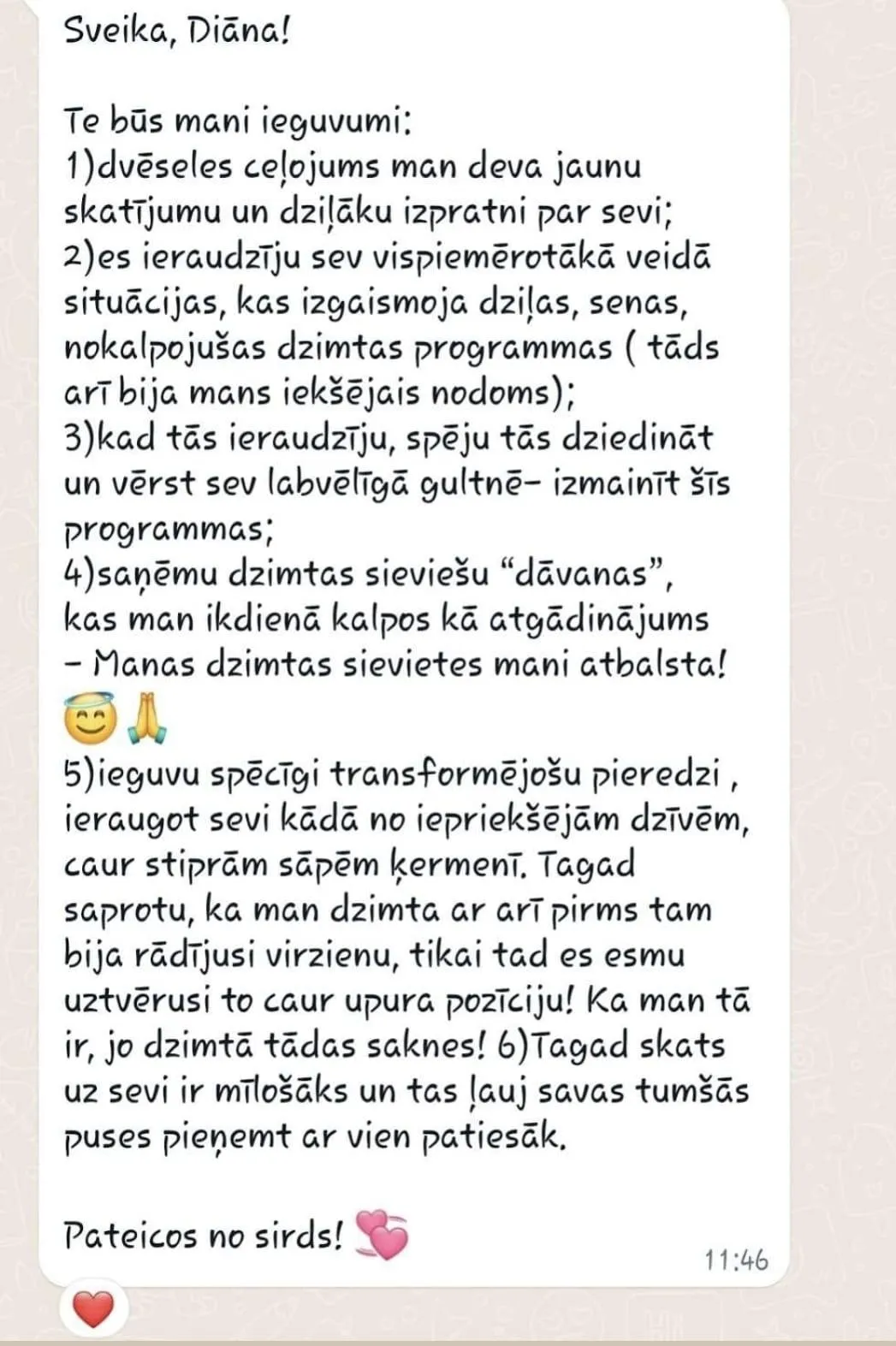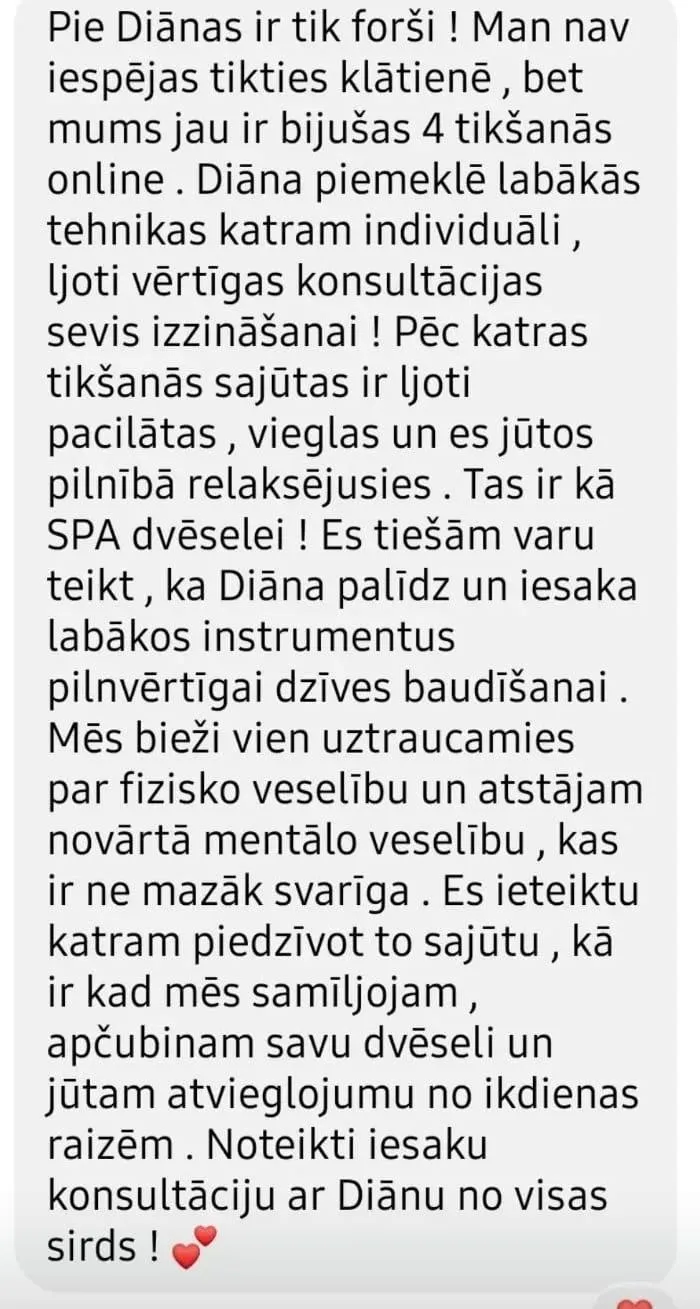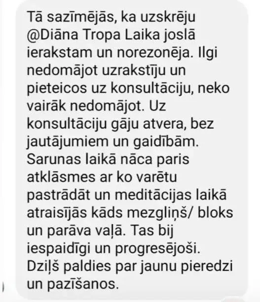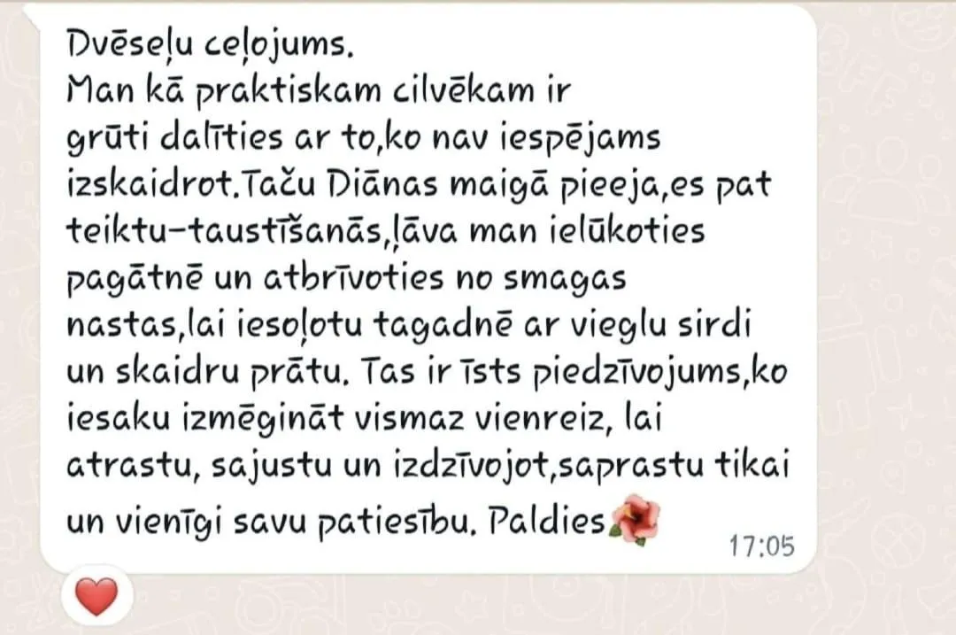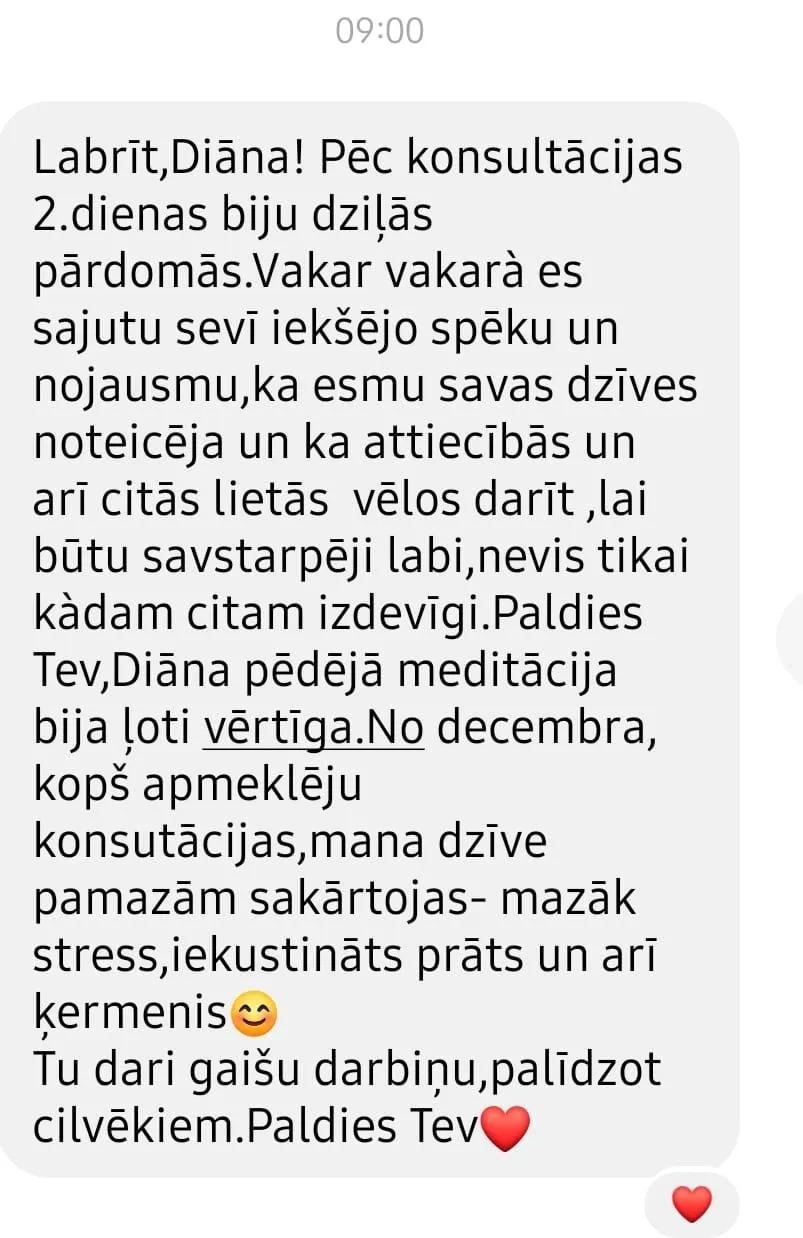 Diāna vienmēr ir bijusi mana "ātrā palīdzība". Šo gadu laikā tik daudz ir kopā pārdzìvots un iziets. Vienmēr sasniegts tas labākais rezultāts- sirdsmiers un prāta skaidrība. Darbs ar sevi ir tas grūtākais. Diāna ir tas cilvēks, kurš parāda ceļu uz gaismu. Un dziedināŝana ir ātra, es pat teiktu -momentāla. Viņa zina un jūt, kad un kas ir vajadzīgs, lai nostabilizētu emocionálo stāvokli un rastu spēku jebkuras problēmas risināšanai.